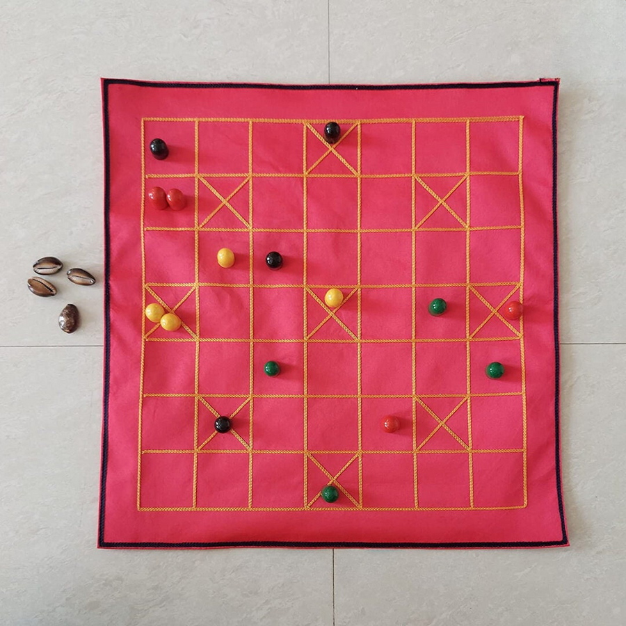 - Traditional Charm: Handmade cotton fabric board and wooden pawns evoke the game's rich heritage, while the option to use cowrie shells instead of dice adds a touch of authenticity.