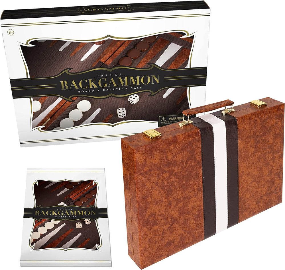 Backgammon Set - Classic Board Game in Brown for Adults and Kids with Premium Leather Case - with Strategy & Tip Guide
