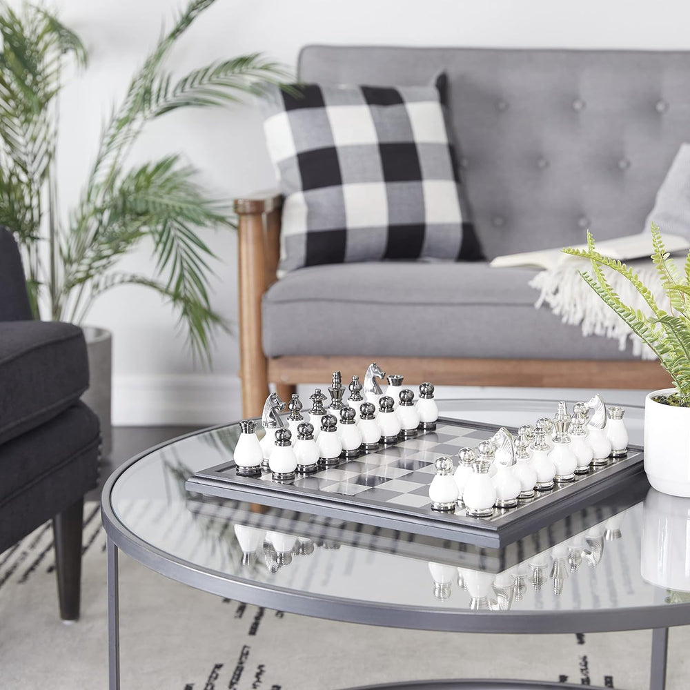 The polished black and white finish is accented by metallic silver and gunmetal details on the chess pieces, creating a luxurious and sophisticated look.