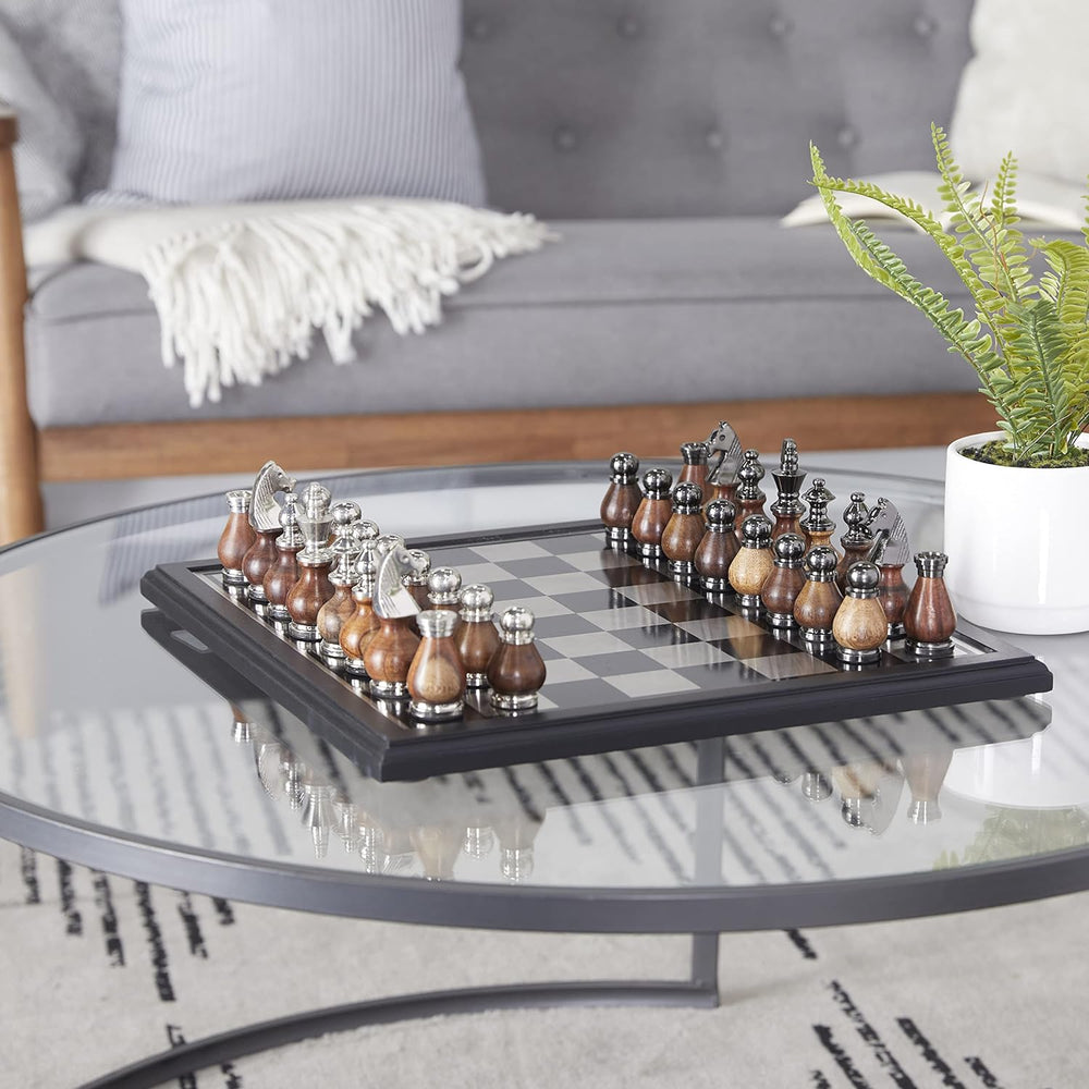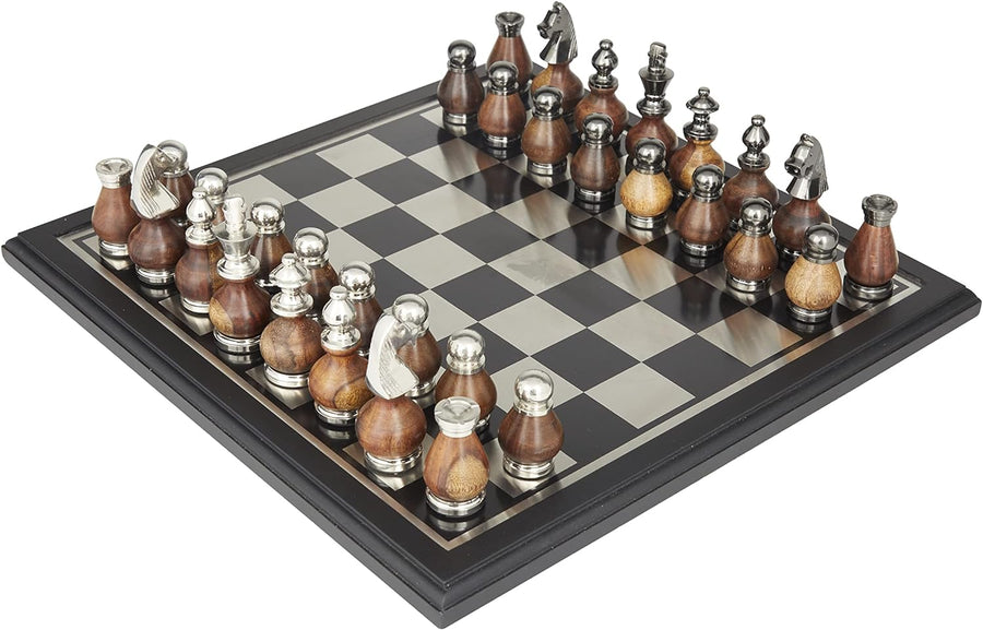 This chess set combines the luxury of mango wood with the durability of aluminum, resulting in a piece that's both beautiful and functional. The black and white polished finish with metallic silver and gunmetal accents adds a touch of sophistication.