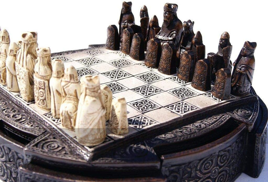 A lovely Lewis Chessmen Chess set featuring an attractive brown colored Resin box with a removable lid. The Isle of Lewis chess set is one of the most recognizable and beloved chess set designs, only second to the Staunton design. The Isle of Lewis chess pieces were first discovered on the Isle of Lewis, in the early 19th century. The set is believed to date back to the 12th century and to be of a Norwegian origin.