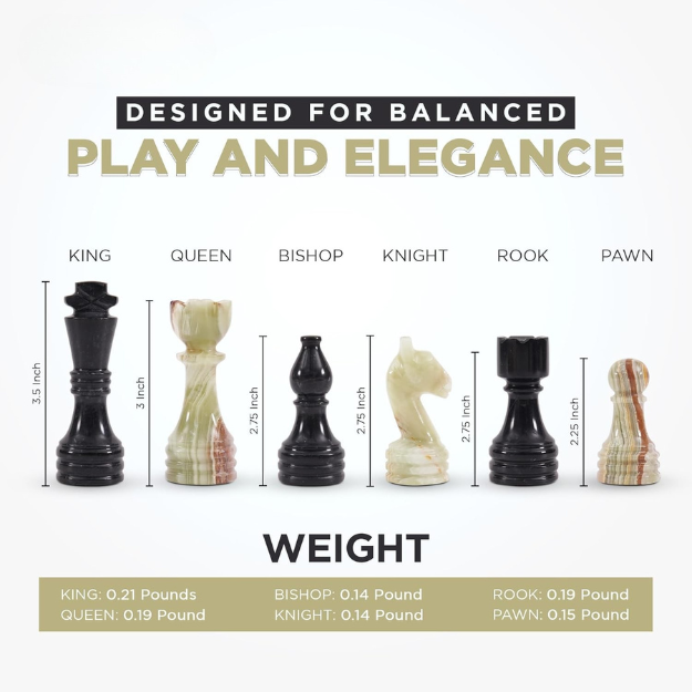 • The king measures an impressive 3.5 inches, with other pieces sized proportionally for a visually balanced playing experience.
