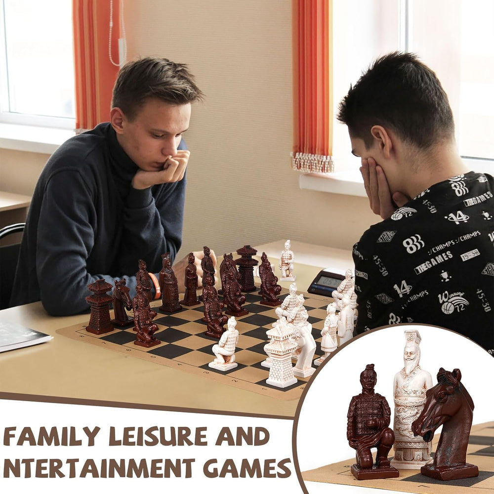 Exquisite Resin Chess Pieces: Crafted from high-quality resin, each chess piece mirrors the design of the iconic Terracotta Warriors. The fine details and craftsmanship bring a timeless charm and elegance to every match.