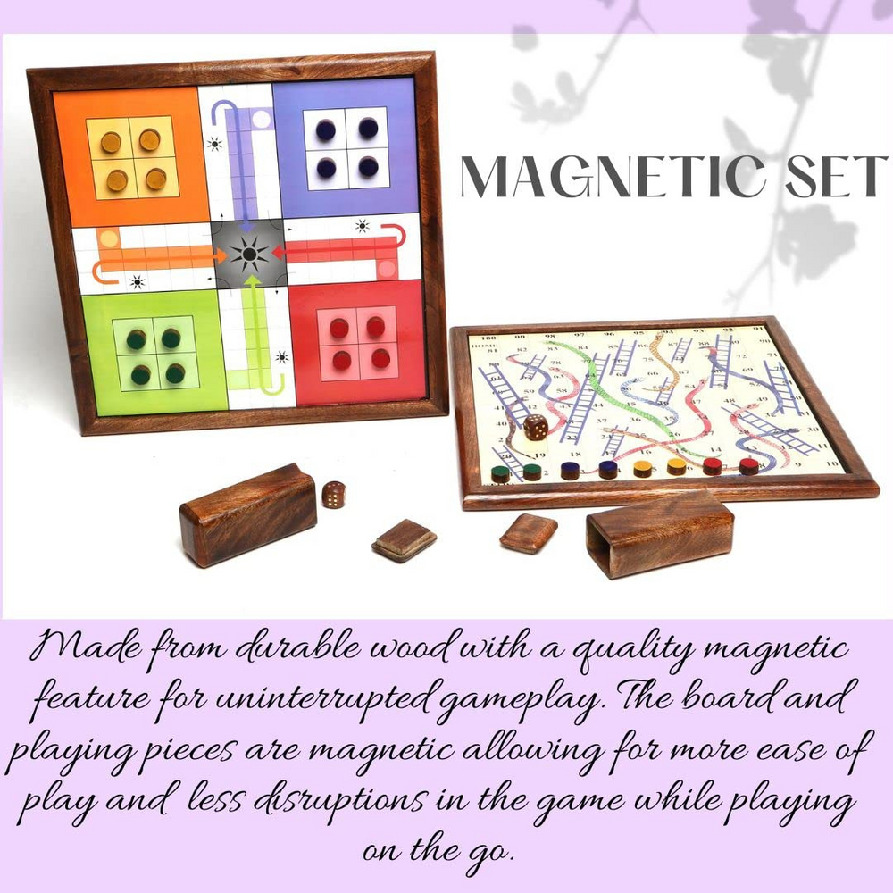 Wooden Classic 2 in 1 Magnetic Ludo Snakes and Ladders Set Travel Board Game for 6 Years and up - (Size - 10.5 x 10.5 inch) - Chess'n'Boards