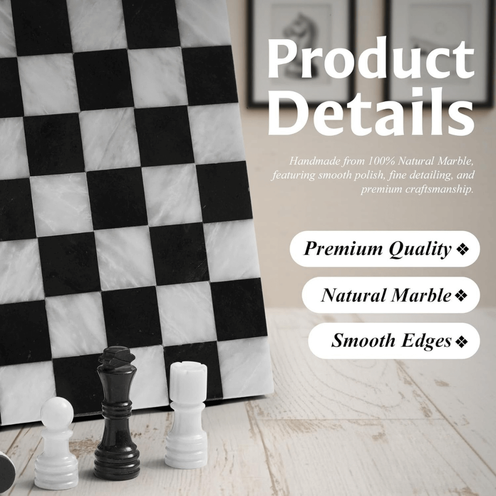 Marble Chess Set 12" Black & White with 32 Chess Pieces & 2 Extra Queens