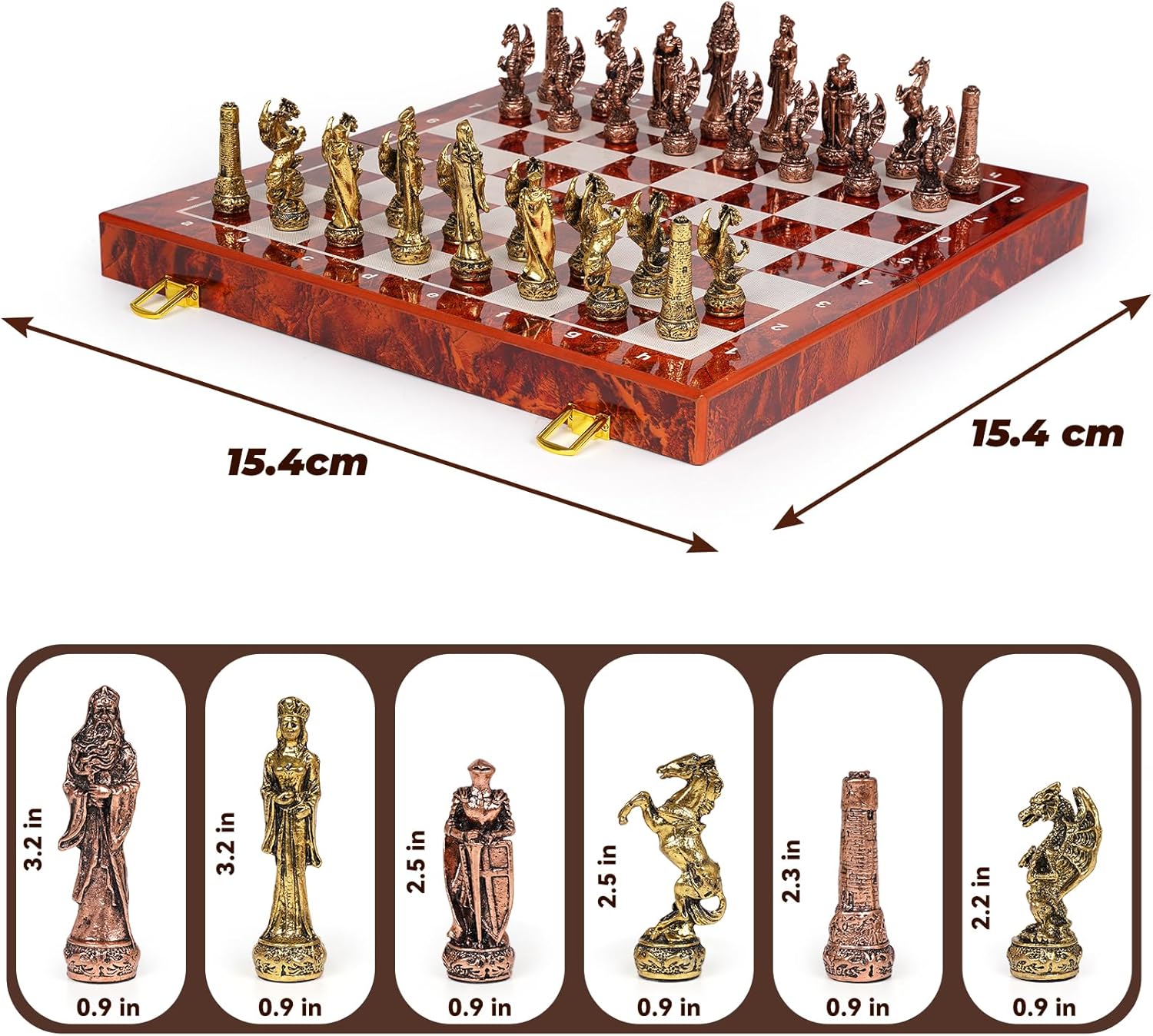 • Exquisitely Detailed Chess Set with Vintage Figurine-Inspired Pieces: This chess set boasts a distinctive charm with its intricately crafted chess pieces, each fashioned from high-quality zinc alloy metal. The careful attention to detail not only enhances the set's visual appeal but also ensures that it stands the test of time, making it a prized addition to any chess enthusiast's collection.