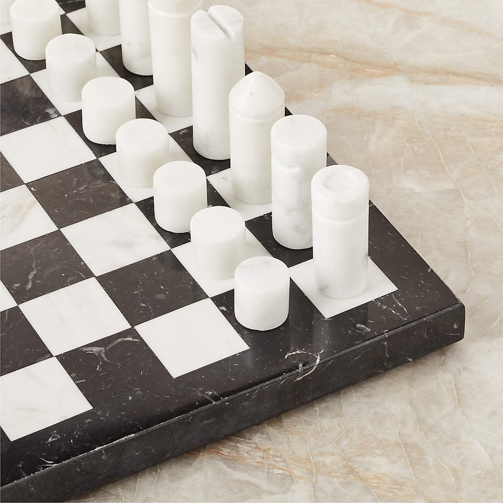 Elevate your game night with the Gatz Black and White Marble Chess Set, a CB2 exclusive. This stunning set features a striking checkerboard design crafted from genuine Marquina black marble and Carrara white marble. The pieces, made from honed Carrara marble and midnight black marble, offer a luxurious contrast and a captivating playing experience.