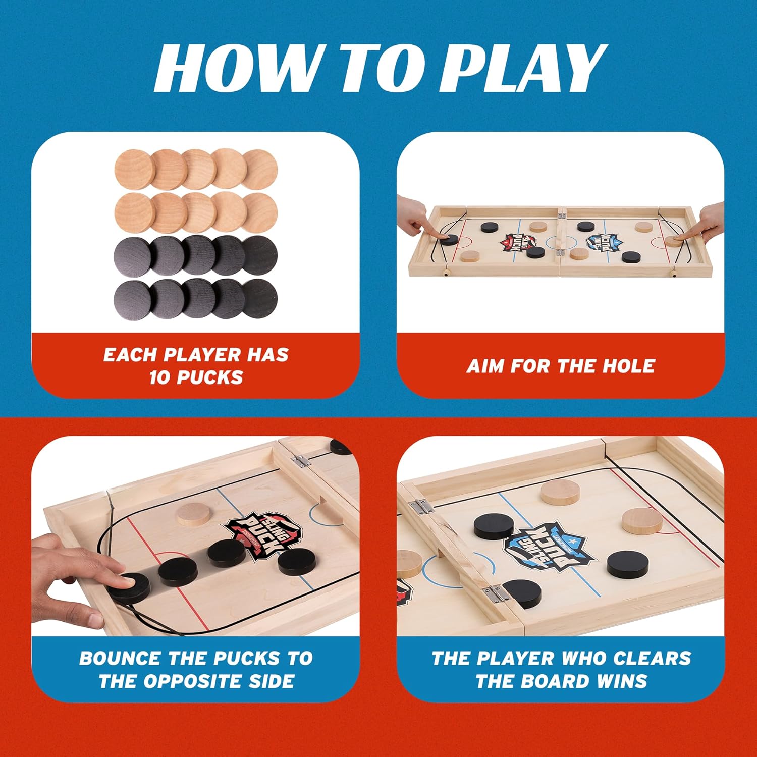 Package Includes Large Sling Puck Board Game in 24 Inch Size with Smooth Wood Frame and Durable Puck Pieces used at Home Indoor Games, Family Nights, Coffee Table Games and Table Top Games for Kids and Adults creating Fast Hockey Action for Gathering